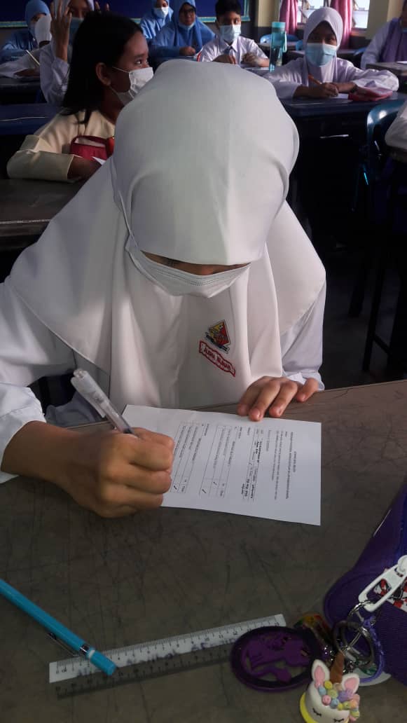 | Murid bersedia untuk mendengar penerangan daripada Puan Arjunawati mengenai keselamatan murid di sekolah |